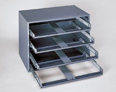 Store and organize your metal cases with this metal case rack. The Durham Metal Case Storage System turns your Durham DL21 or DL32 Metal Cases (sold separately) into drawers, making them more manageable. The Case Rack holds four Steel Cases, each of which can be pulled out individually and opened. The reinforced rack can support the weight of an extended case without tipping, so it's perfect for your workbench. The Metal Case Rack features cold rolled steel construction with a gray enamel finish.
