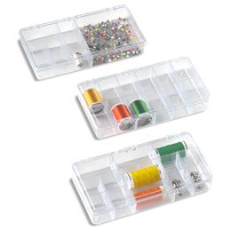 Size - 12-(8-1/4" x 4-1/2" x 1-3/8" h). Our Clear Compartment Boxes are made of commercial, crystal clear polystyrene for the ultimate in visible storage and durability. They're the perfect solution for small tools and sewing notions, craft and hobby supplies, hardware and electronic parts. The compartment dividers extend to the top of the box to keep each cell's contents in place. They are available in a variety of compartment sizes and configurations. Read more...
