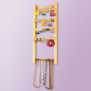 Wall mount jewelry organizer keeps earrings and necklaces in plain view for easy selection. Never worry about items getting mangled, tangled, or lost again. Specially designed slots and holes hold approx. 42 pairs of post and wire earrings. Necklaces stay neat and organized on 5 pegs. Mounting hardware included. Wood, 18 x 7 1/2 x 3/16". Read more...
